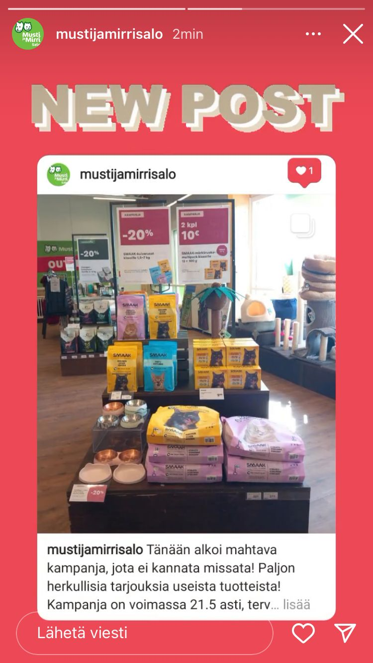 Pääsin tekemään yhden Instagram postauksen Salon myymälän tilille sekä tein siitä myös story postauksen. Aloitin tutustumalla aikaisempiin postauksiin, jotta osaan tehdä saman tyylisen itsekin. Sitten jatkoin ottamalla kuvat kampanja esillepanoista ja muokkasin ne hyviksi. Sitten tein julkaisun ja kirjoitin siihen kuvatekstin. Sitten pääsin julkaisemaan postauksen ja tämän jälkeen tein siitä myös storyn.
